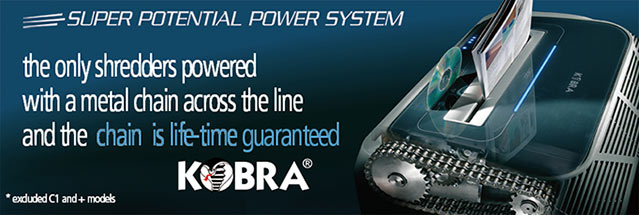 KOBRA Shredders, designed and made in Italy by Elcoman, are renowned throughout the World for their High Quality, Long Lasting Durability, and Innovative Technology. KOBRA Shredders cover the whole spectrum of Data Destruction including Optical Media. Exceptional Style is combined with many special features like 24 hr Continuous Motors, special carbon hardened steel gears and metal chain drive systems, environmentally friendly Energy Smart, 100% Anti Jam auto reverse, Automatic Oiling, and Metal Detector systems. KOBRA shredders are equipped with environmentally friendly Energy Smart systems™. After not being used for 8 seconds, the shredder goes into standby mode and is restarted by inserting material into the machine. The latest Touch Screen range features automatic disconnection from the mains power supply when the machine has not been used for 4 Hours. ... Read More Read Less