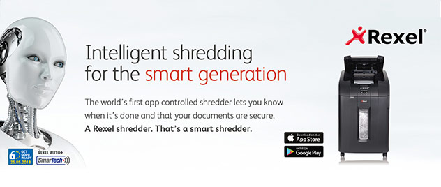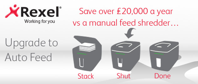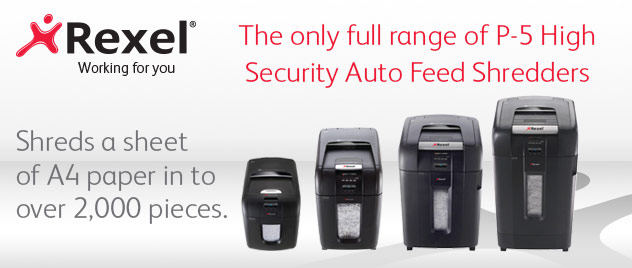 Rexel Shredders by Acco offer a large selection of machines covering virtually every Personal, Office or Departmental requirement. Rexel's product range includes their award winning Auto+ (pronounced 'Auto Plus') shredders that allow you to load up to 750 A4 sheets of paper and walk away while the machine automatically shreds, saving you up to 98% labour time. Many of Rexel's products come with other innovative features such as Mercury Anti-Jam technology to prevent messy paper jams by not allowing too much paper to be offered to the entry throat. If you need help selecting a model, you can download a handy Auto Feed Buyers Guide here