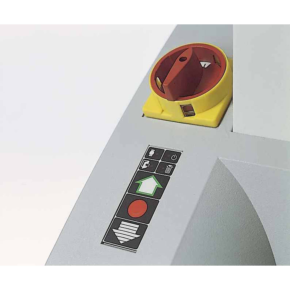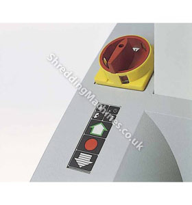 The P-4 Powerline 450 has an extra-large feed in slot for flat stacks of paper, plus an ingenious rotary hopper for feeding crumpled paper directly into the cutting head. (The P-5 machine does not have the hopper). Emergency Stop button conveniently located on RHS of feed slot.