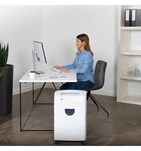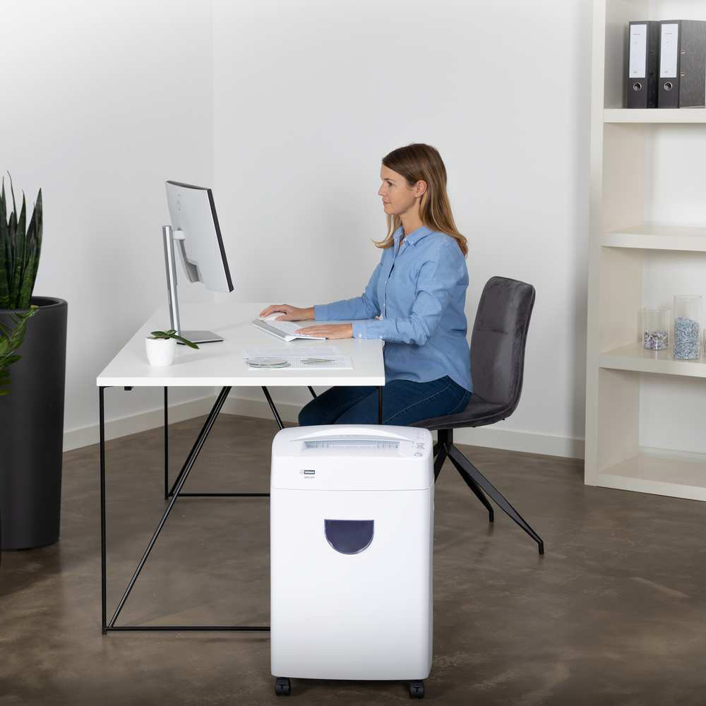 A substantial 42-litre removable bin, equipped with a viewing window, simplifies waste disposal and holds up to 860 shredded sheets of paper, reducing the frequency of emptying. An acoustic indicator alerts users when the bin reaches full capacity. Additionally, the shredder's mobile design includes lockable castors, making it easy to relocate as needed within the office.