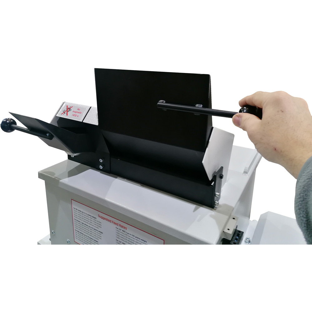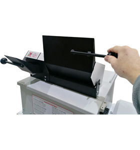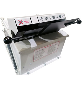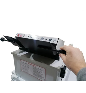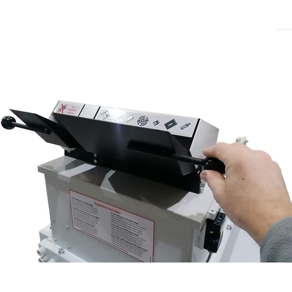 Designed with safety in mind, the cutter unit has a feed lever, keeping operation tidy and controlled. To process larger media or multiple HDDs in parallel when needed, lift the hopper top cover. For safety, a limit switch cuts off the shredder while the top cover is open, and also while the control cabinet door is open to add another safety layer. The result is high-capability destruction with an operator-friendly workflow.