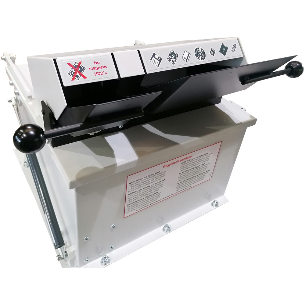 - Two cutting units in one machine - one for HDDs and larger data media, one for flash media