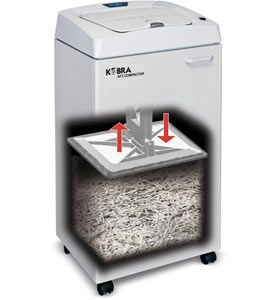 KOBRA AF.2 features a large paper tray for up to 400 sheets and a separate entry for manual feed shredding. The KOBRA AF.2 Auto-Feed/Auto-Compact shredder is equipped with a continuous-duty motor without overheating, a sturdy chain, and metal gear driving system for the highest durability and reliability and a special Oil-free System.