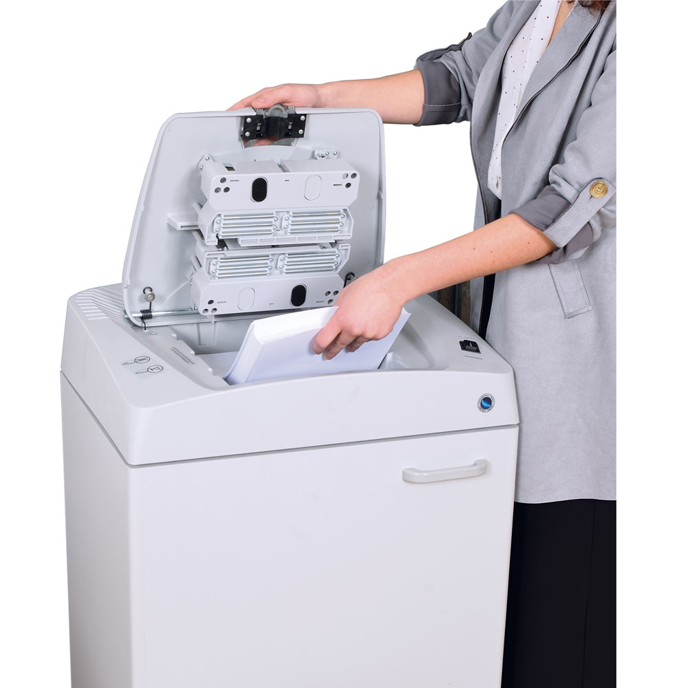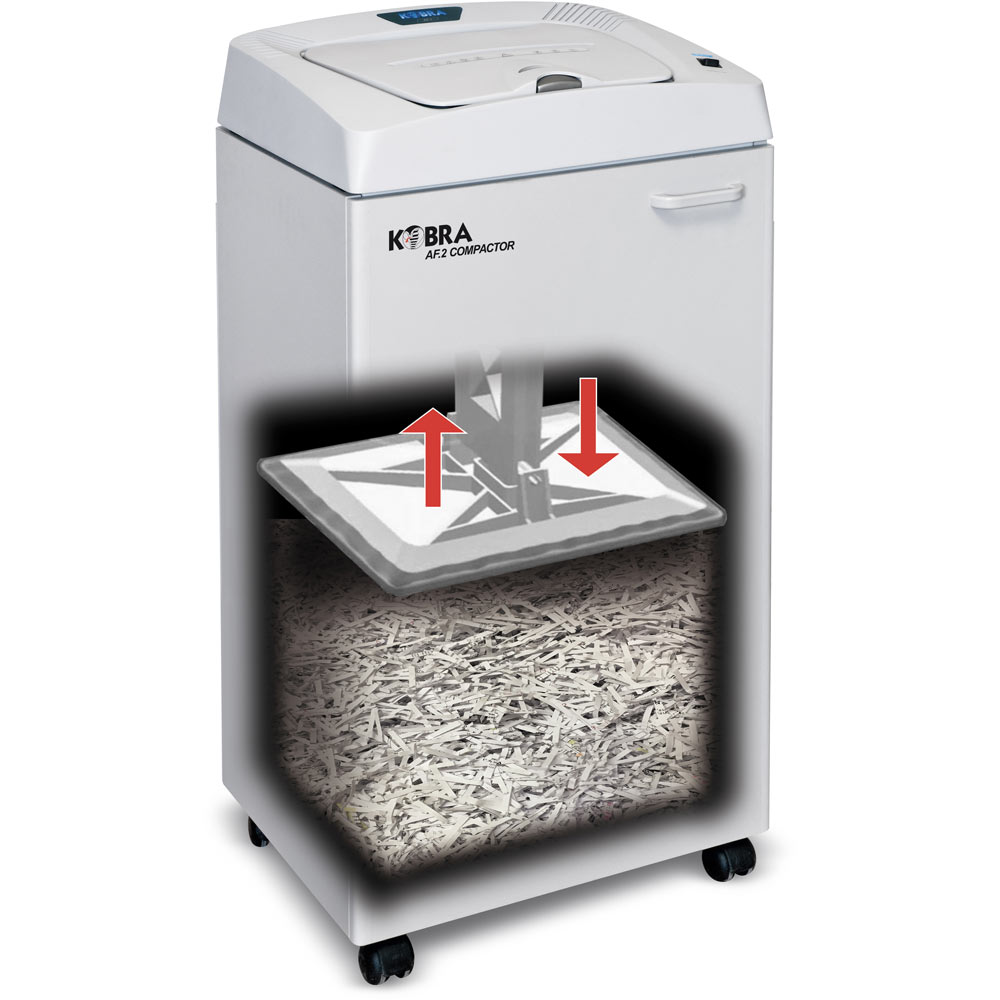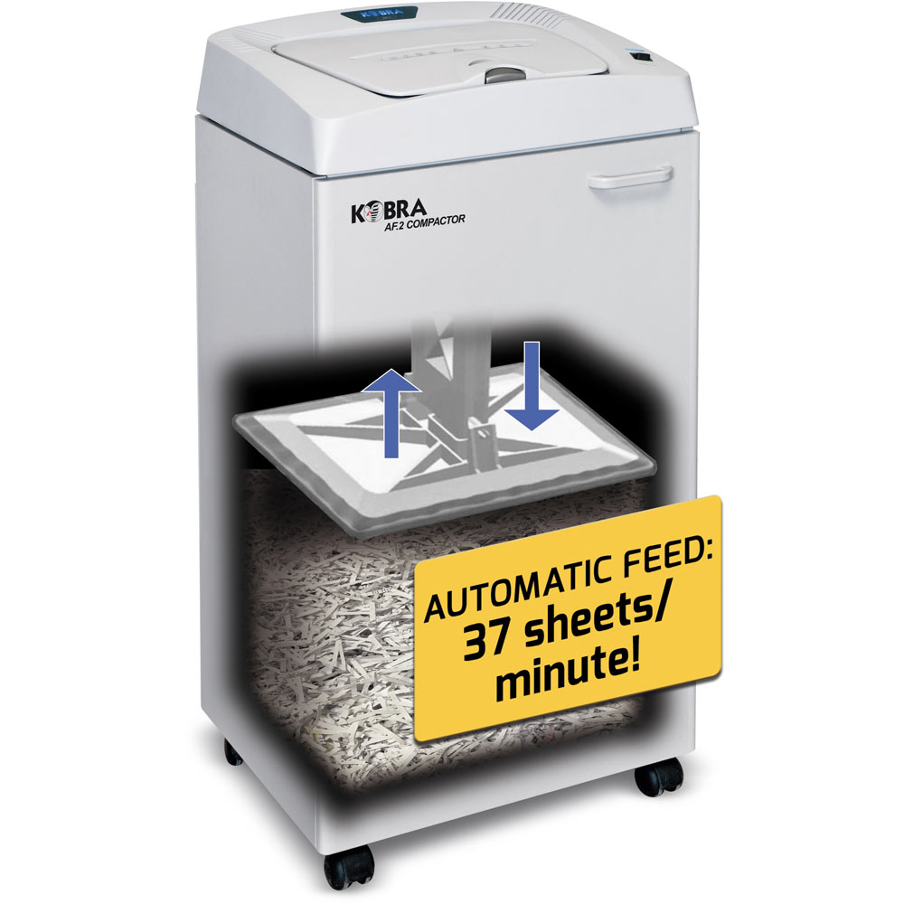 KOBRA AF.2 Auto-Feed/Auto-Compact shredder is the most innovative and fastest automatic shredder available in the global market: the special paper Compacting System optimises bag capacity and avoids frequent emptyings, increasing by 4 times - from 150 to 600 litres - the size of the cabinet and its incredible 37 sheets per minute speed allows walkaway fast shredding of large quantities of documents.