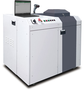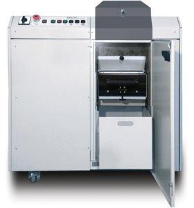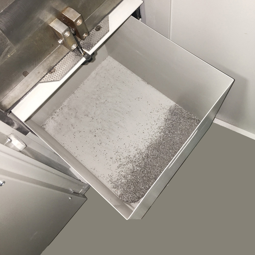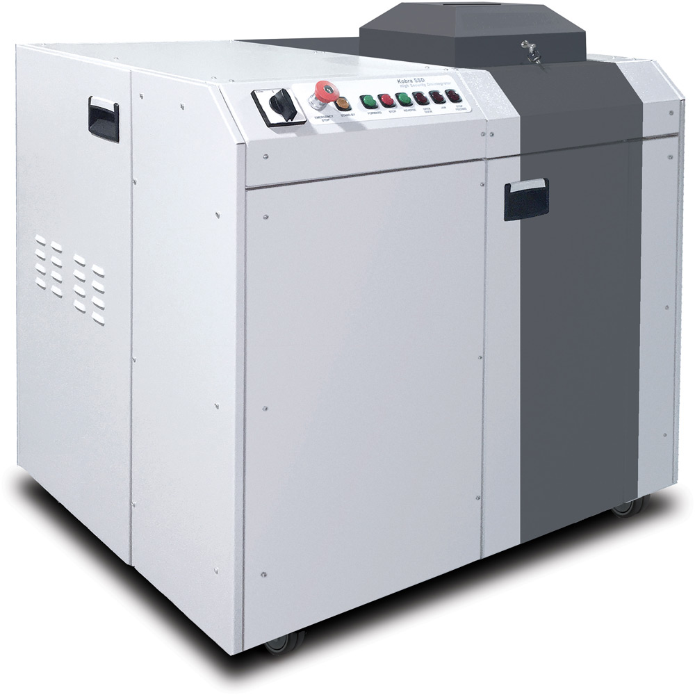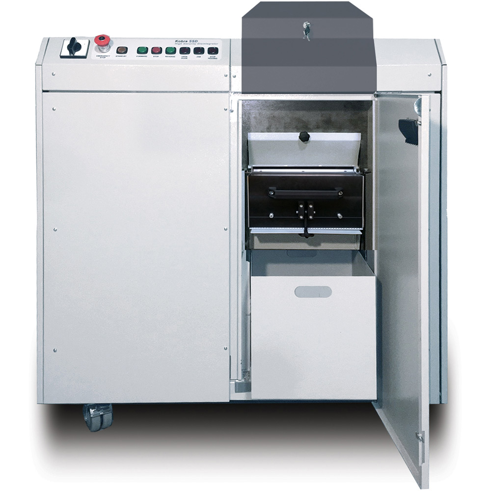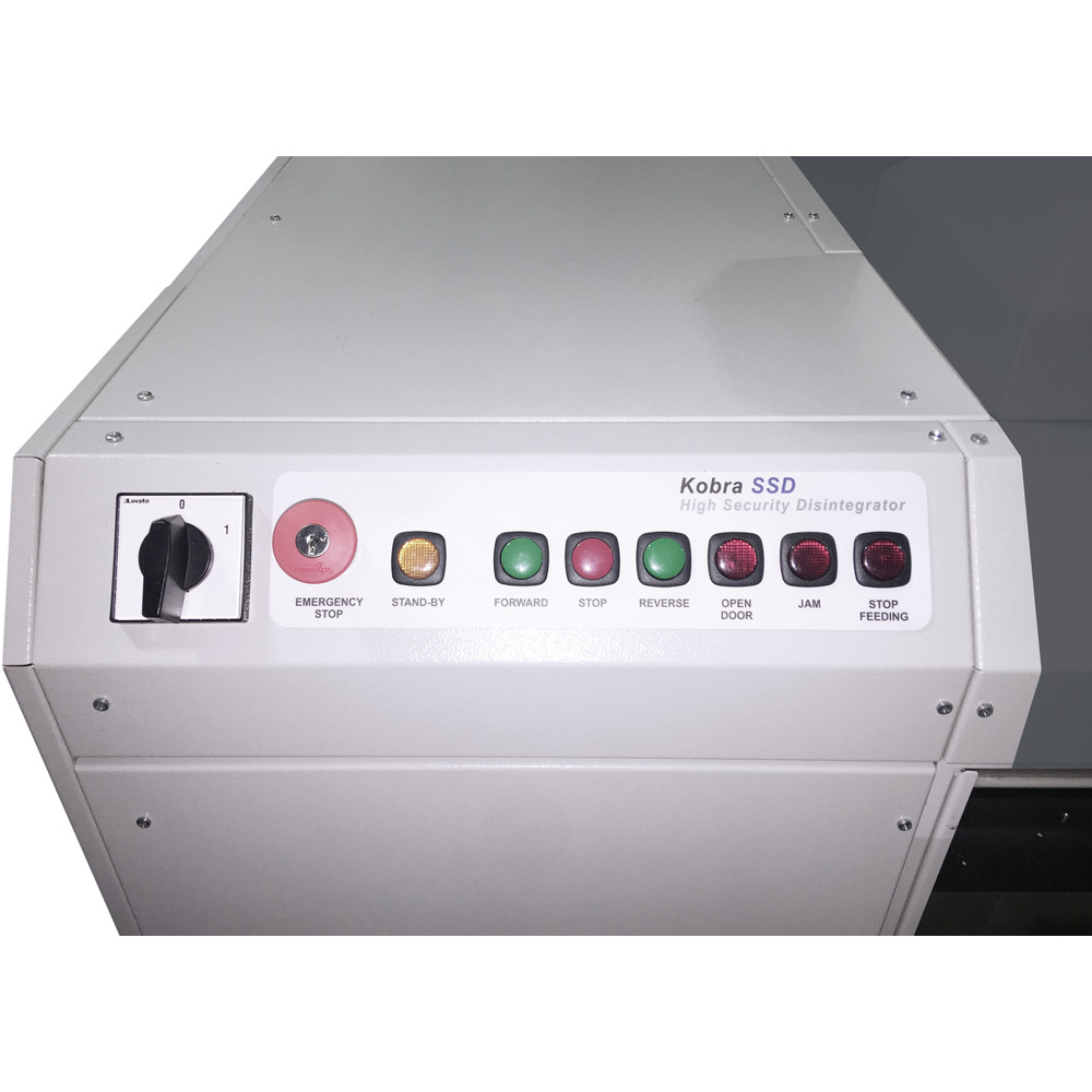 Features on the Kobra SSD include electronic safety lock out and shut down monitoring systems for bin access door, air filtration system access door and feed hopper, automatic reverse in case of accidental jam, two stage destruction operation with a large 180 mm diameter 16 blade grinders second stage for complete and reliable destruction, lighted indicator displays to keep the operator informed of machine’s operating status, front mounted large lockable emergency stop switch for safety. Electronic monitoring system continuously adjusts the operation of both stages for reliable synchronous operation. Please note the Kobra SSD is designed specifically for solid state devices PCBs, credit cards, DVDs and CDs. Shredding of other materials will damage the unit. Output may vary depending on size and density of devices and supply voltage. The Kobra SSD is the perfect device for your solid state destruction applications backed by Kobra’s over 30 years of experience in manufacturing of multi-media destruction equipment.