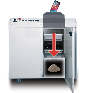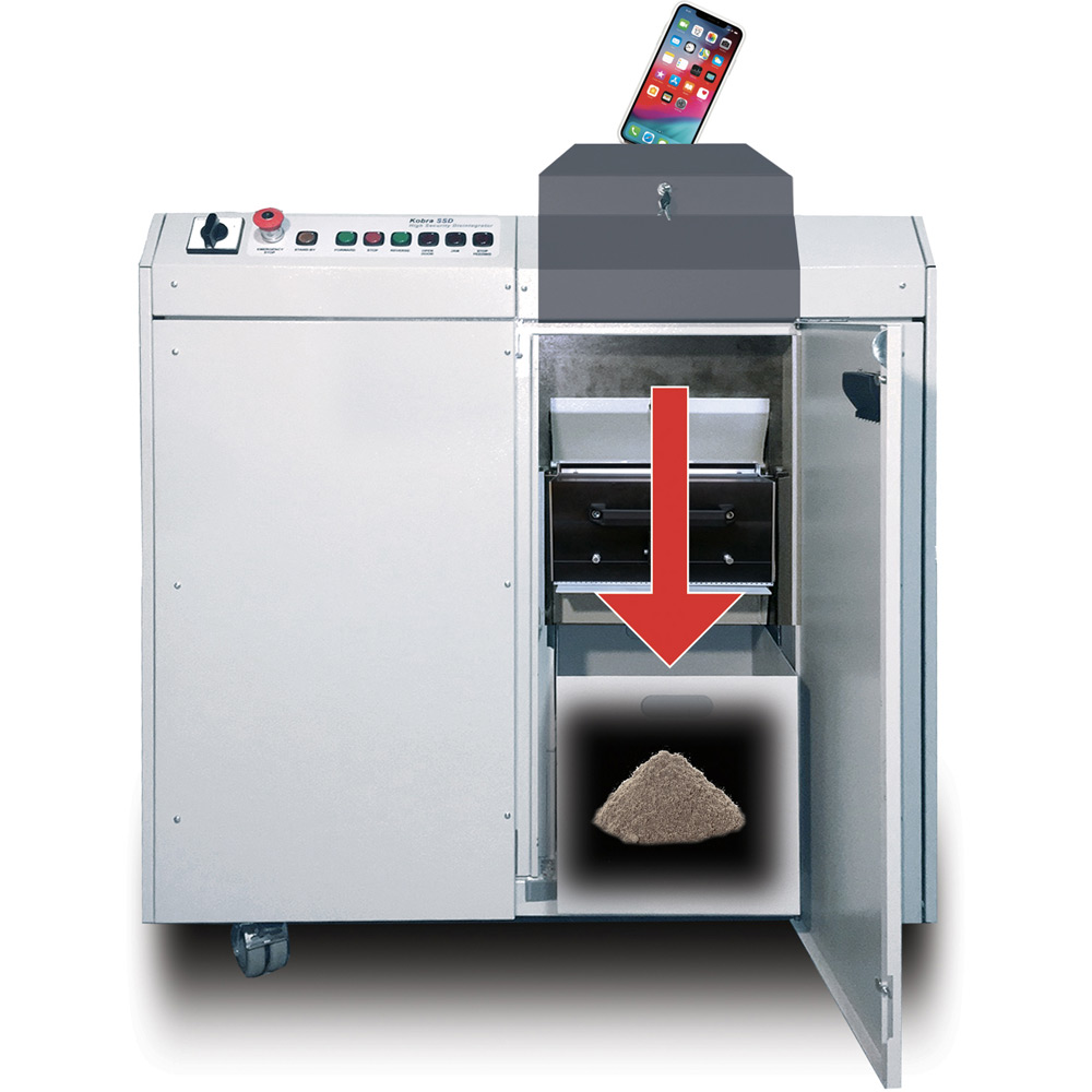 The Kobra SSD is a solid state drives/devices shredder capable of destroying solid state drives, smartphones, memory sticks, iPads, USB memory devices, pen drives, tablets, circuit boards, credit cards and ID cards with embedded electronic chip and/or magnetic media, CDs/DVDs, flash memory IC chips, CPU chips with internal ROM and/or flash memory. Shredded material is reduced to sand-like texture particles. On this model, Kobra SSD reaches and exceeds NSA/EPL 9-12 requirements for the destruction of solid state devices.