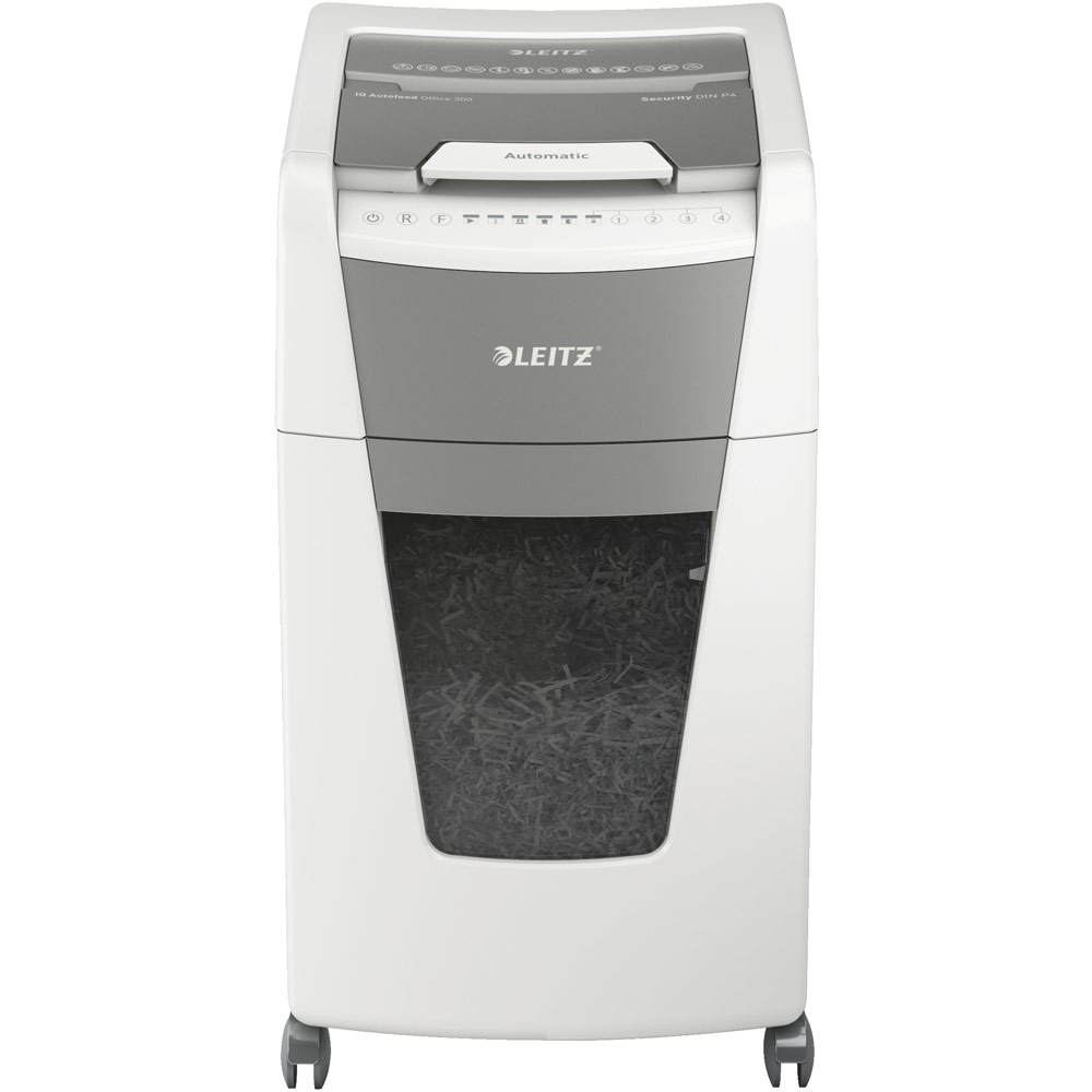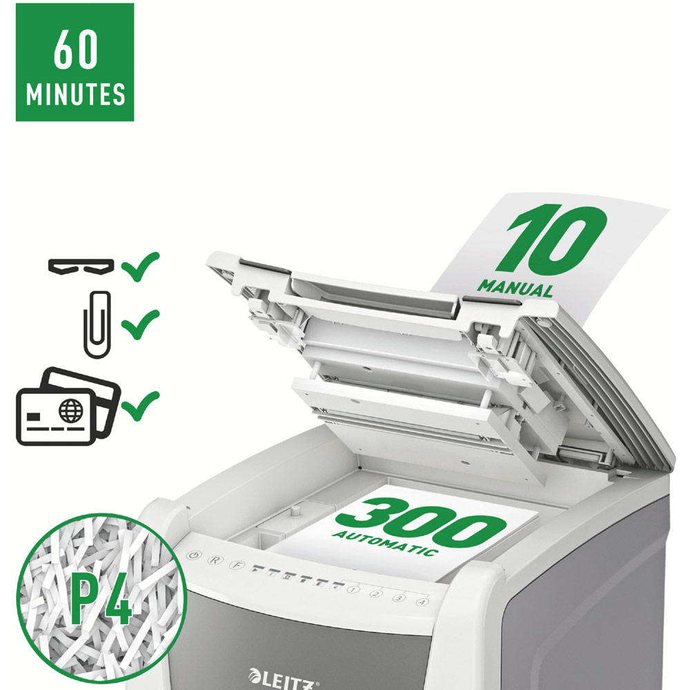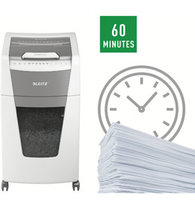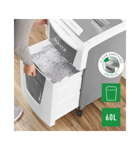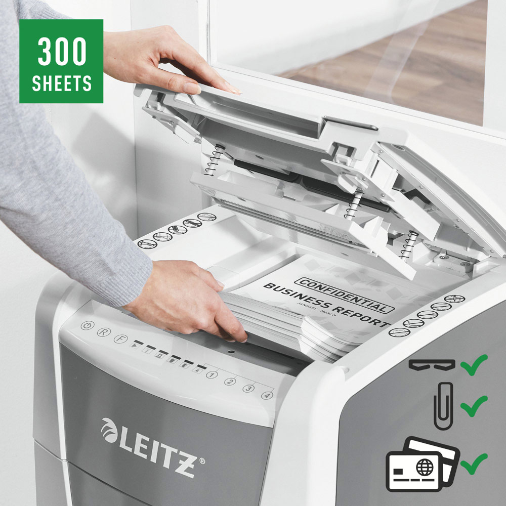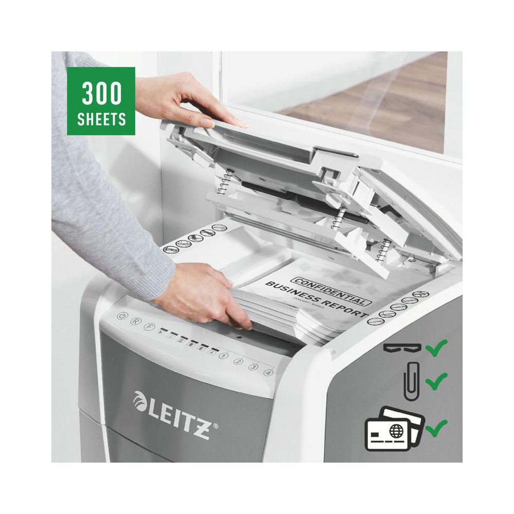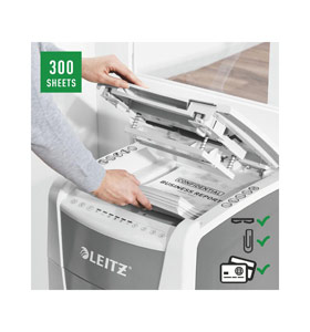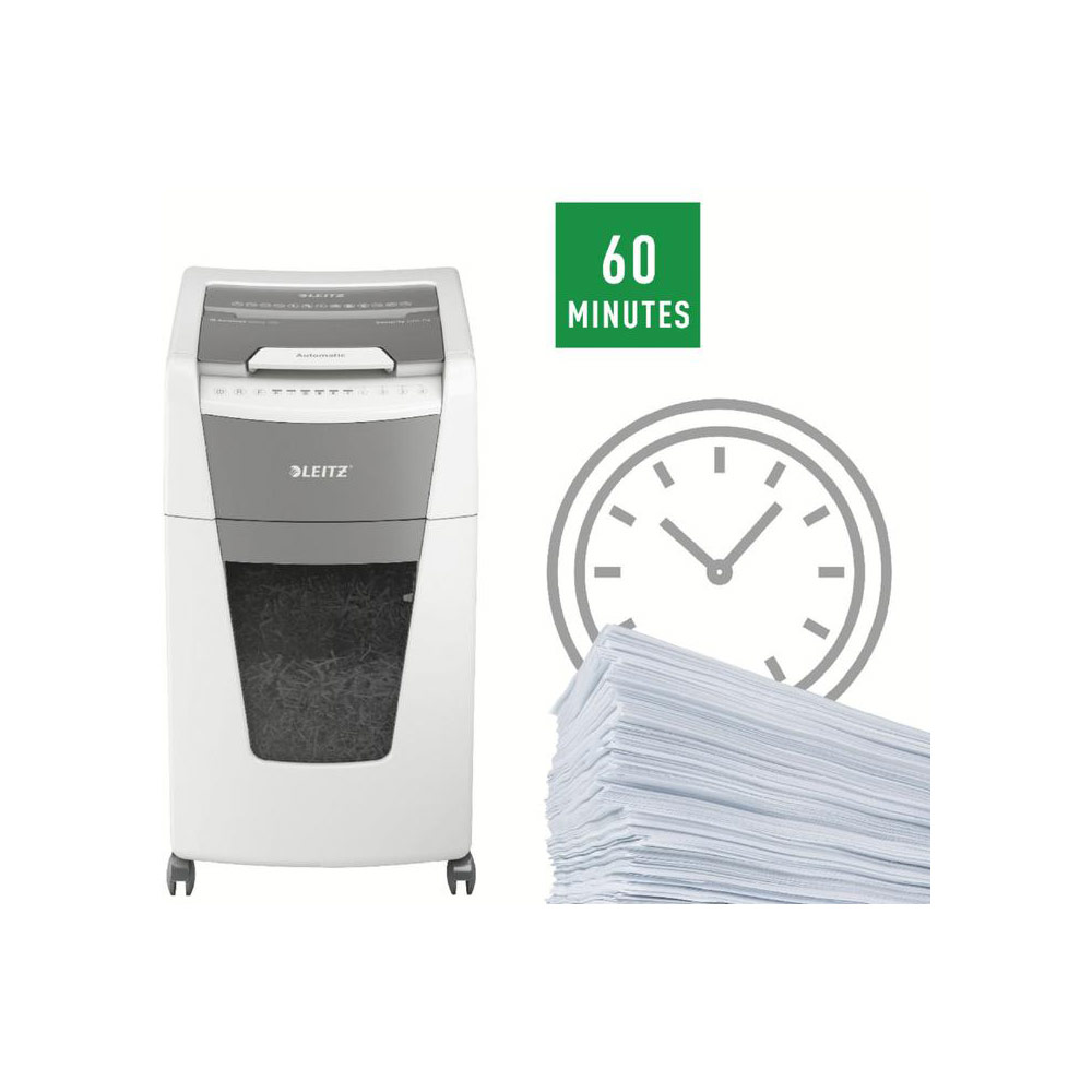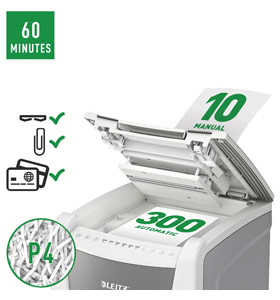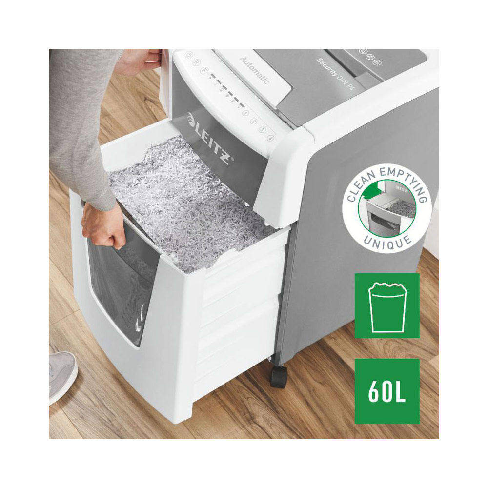 Fully automatic paper shredder from Leitz with unique clean emptying feature. So intelligent it quietly works on its own, just insert your stack of papers (incl. staples & paper clips), close the lid and get on with your day. Ideal for office use. Confidential security and excellent performance with this anti jam, quiet and long running (60 min) autofeed shredder. Automatically shred 300 sheets of A4 into security P4 (4x28mm) cross cut pieces in one go into the generous 60L bin. Simple operation using touch controls.