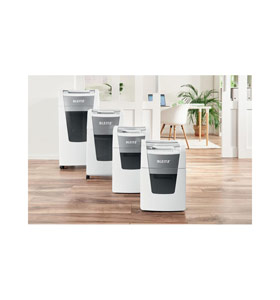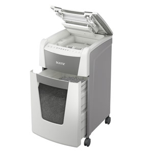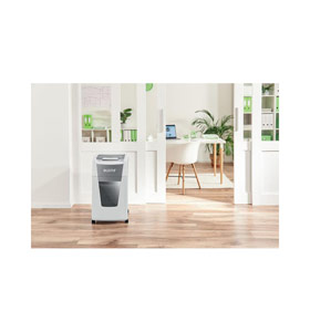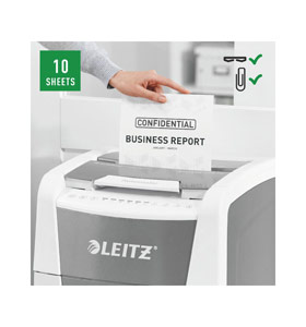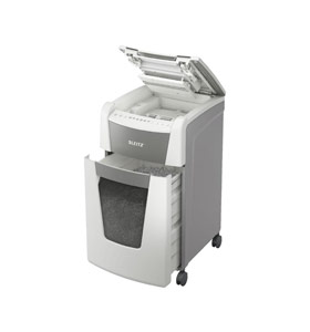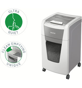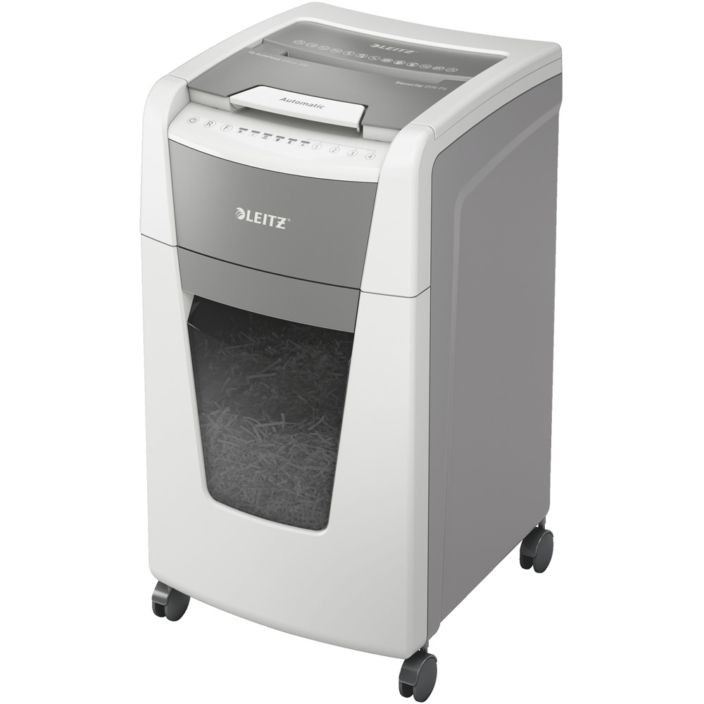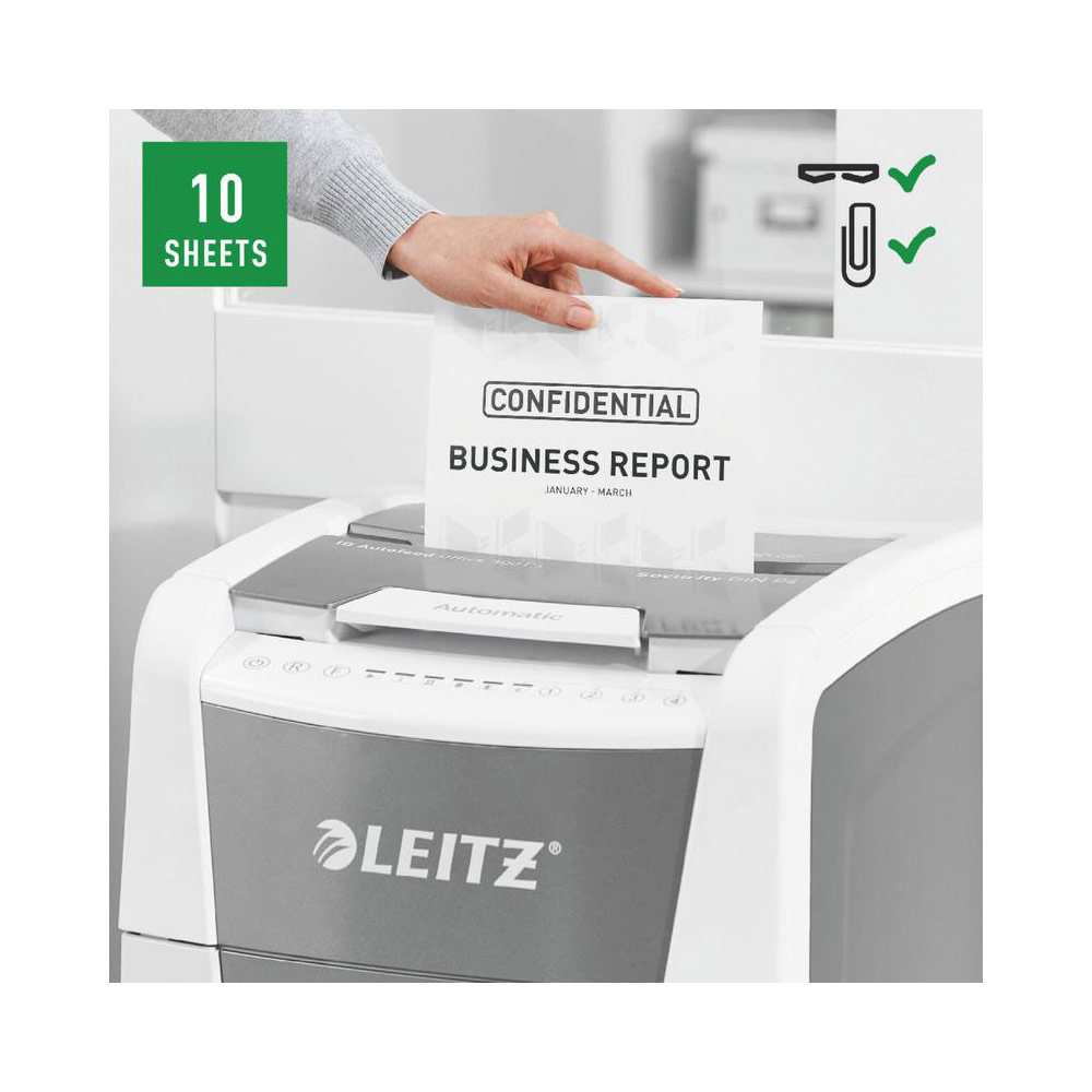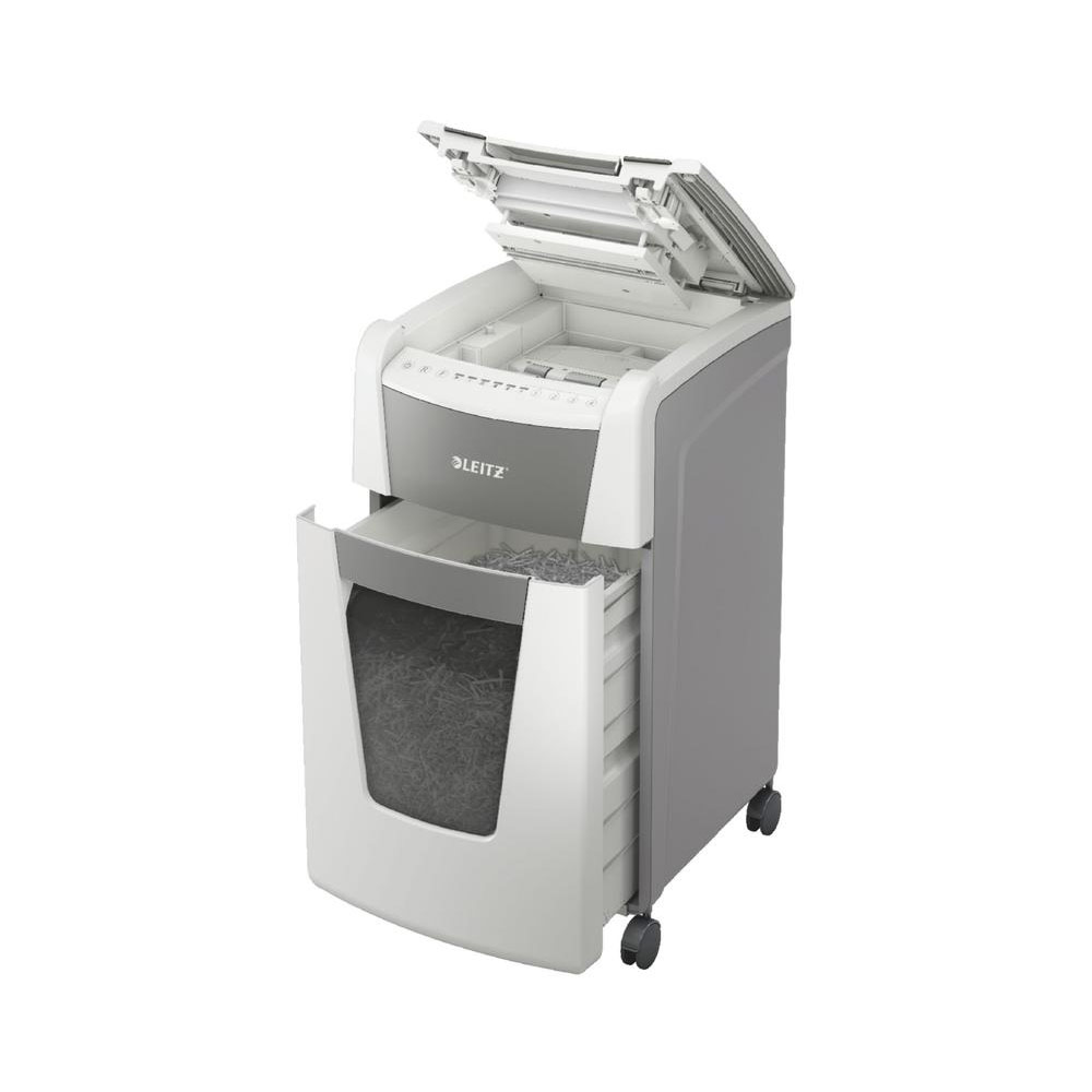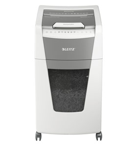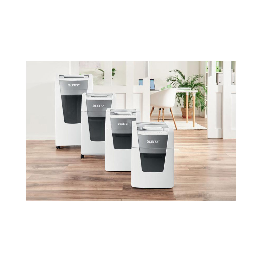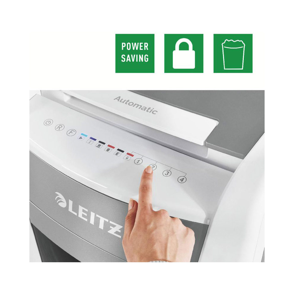 Fully automatic paper shredder from Leitz with unique clean emptying feature. So intelligent it quietly works on its own, just insert your stack of papers (incl. staples & paper clips), close the lid and get on with your day. Ideal for office use. Confidential security and excellent performance with this anti jam, quiet and long running (60 min) autofeed shredder. Automatically shred 300 sheets of A4 into security P4 (4x28mm) cross cut pieces in one go into the generous 60L bin. Simple operation using touch controls.