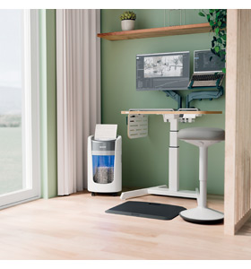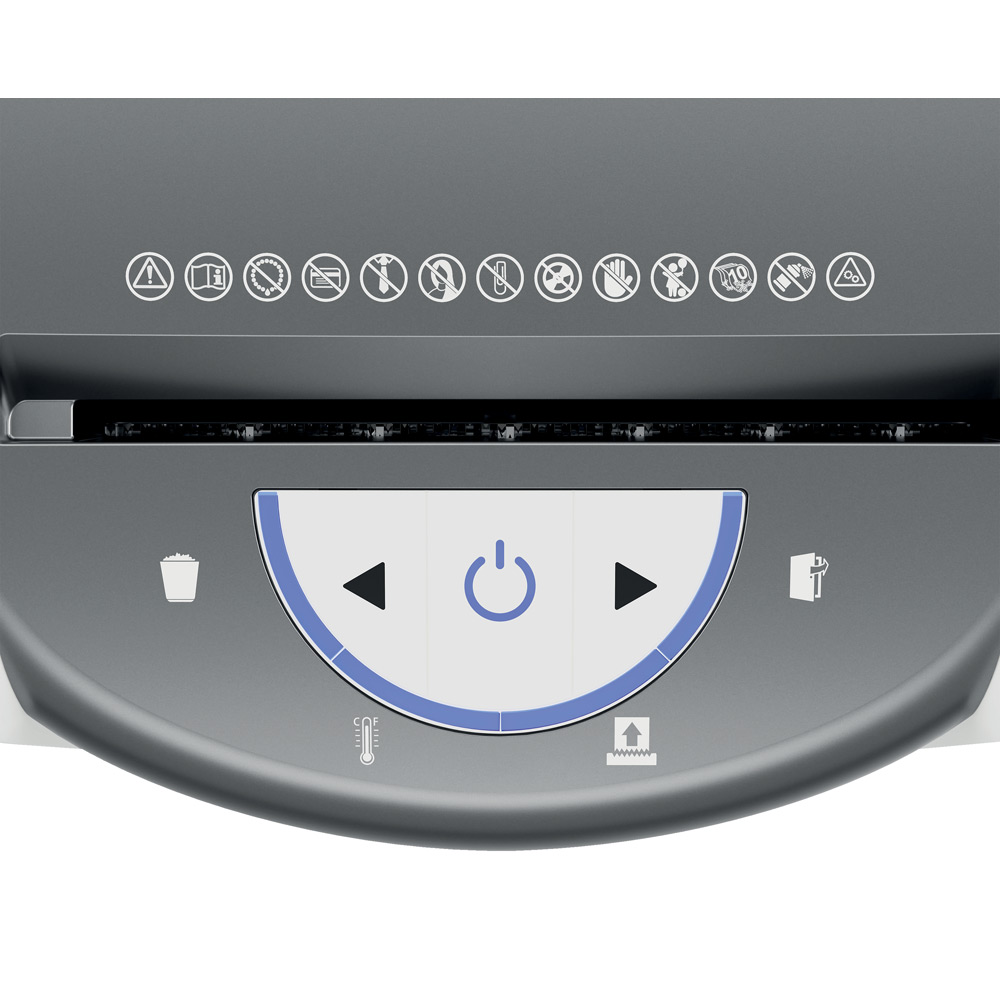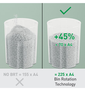 Equipped with innovative Bin Rotation Technology (BRT), the shredder maximises the bin's storage efficiency by 45%*, flattening shredded material for more even paper distribution and extended shredding capacity. The 15-litre bin holds up to 225 A4 sheets and is illuminated with a blue light during operation, while the 'bin full' alert only activates once the bin is completely full - eliminating unnecessary interruptions. The intuitive LED display provides clear notifications for bin full, door open, overheating, and overload.