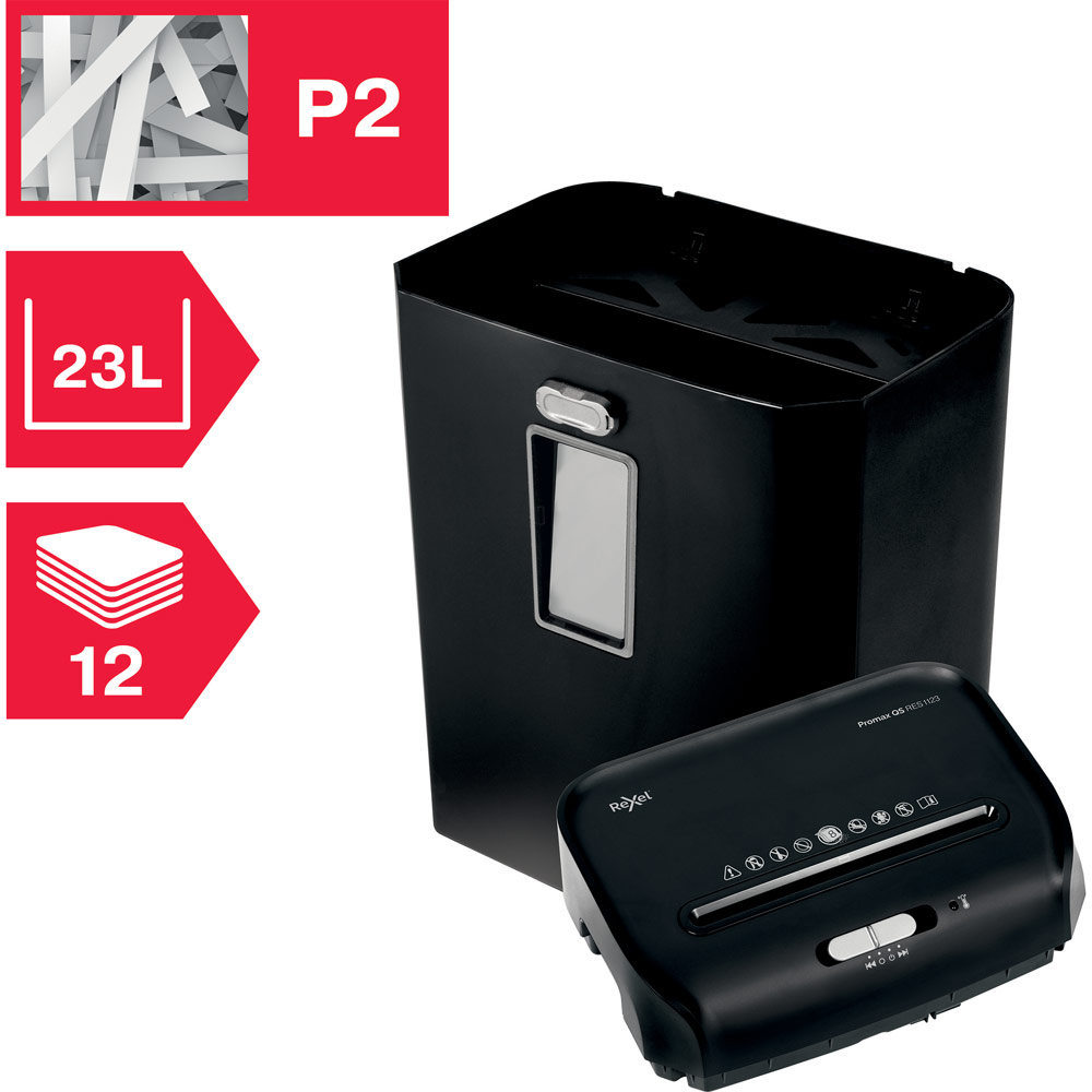The ProMax QS RES1123 shreds up to 12 sheets (80 gsm) at a time in to P-2 (6mm) strip cut pieces, with a 23L bin which holds 192x A4 sheets.