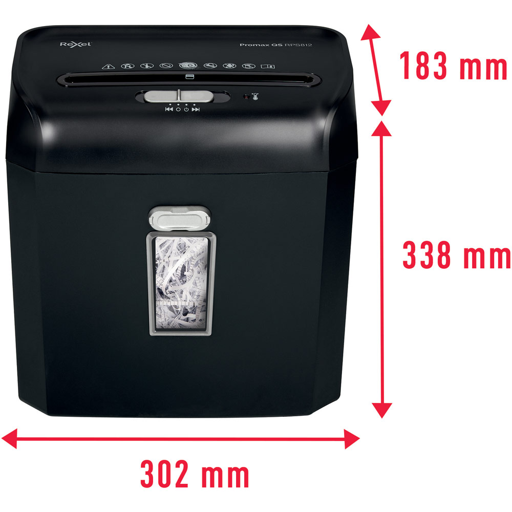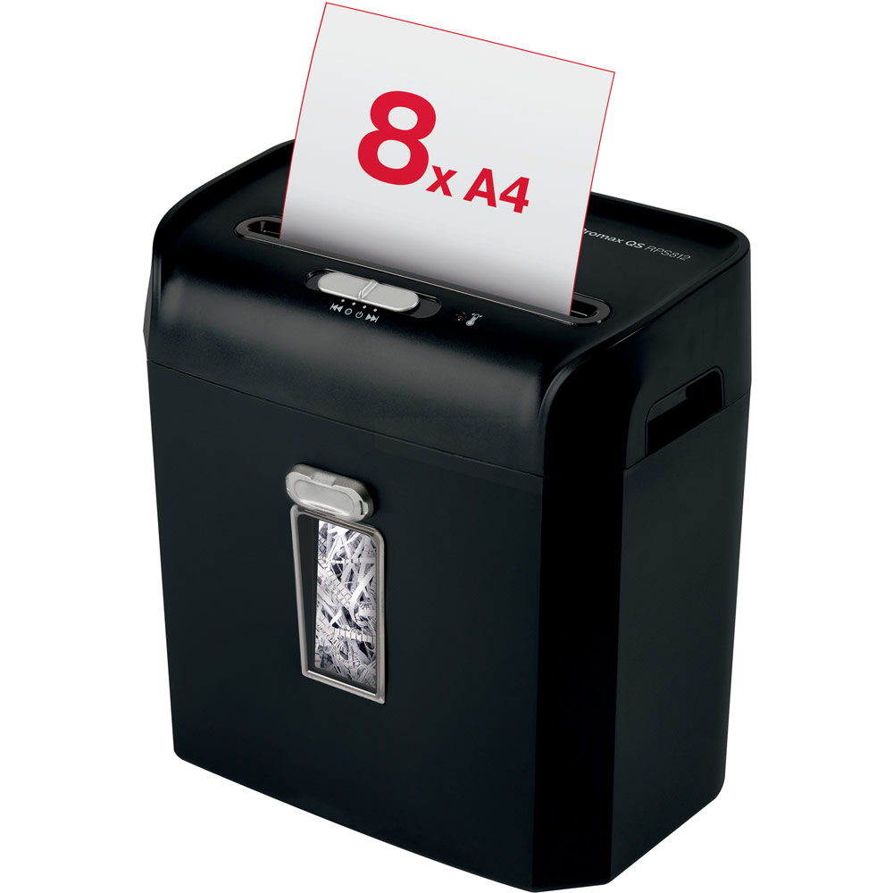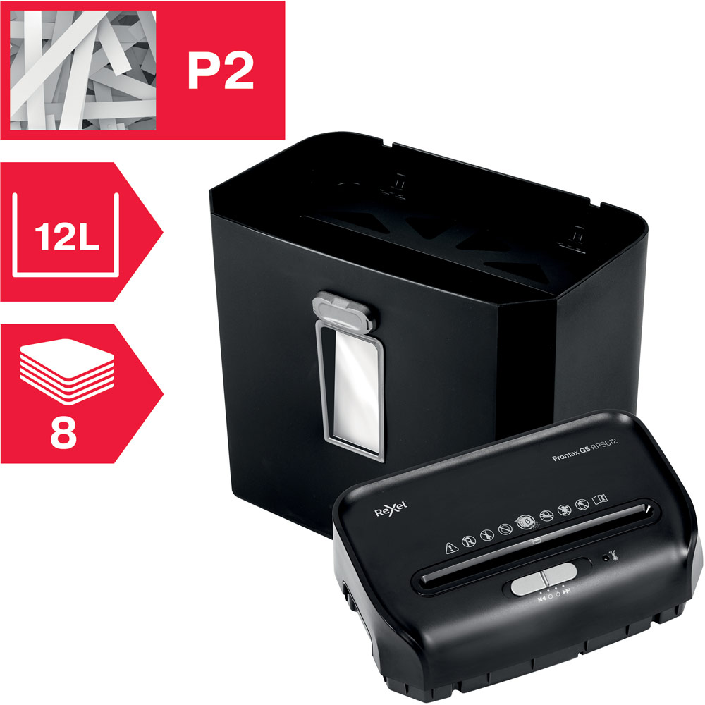 The ProMax QS RPS812 shreds up to 8 sheets (80 gsm) at a time in to P-2 (6mm) strip cut pieces, with a 12L bin which holds 88x A4 sheets.