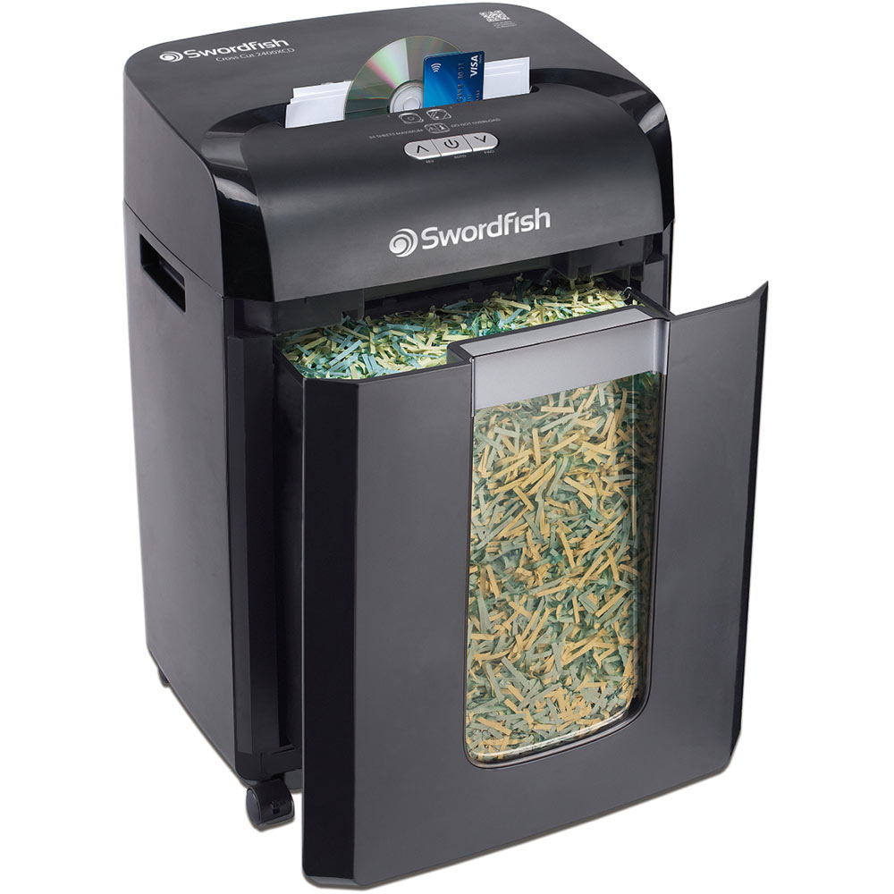 The Swordfish 2400XCD is a high capacity shredder that provides the ideal solution for high demand office environments. The 2400XCD offers high security shredding, with a P-4 security level. It will shred an A4 sheet into 4x35mm cross cut pieces and can shred up to 24 sheets of paper in each pass, allowing you to shred 6000 sheets per hour. The 2400XCD has a 30 minute continuous run-time and the generous 30 litre pull-out bin will hold 610 sheets of A4 paper before needing to be emptied.